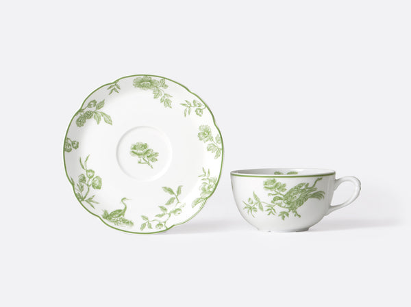 With its elegantly fine sketches, Albertine is a poetic decor that echoes the trend of the famous toiles de Jouy. Here, the green is soft, the vegetation delicately dresses each plate and pieces of the cabaret. Through the foliage and wild blackberries, you can see lovely birds – titmice, herons, ducks and pheasants. A romantic and bucolic decor emphasized by its scalloped edges. An invitation to stroll within a budding grove. Pieces sold individually.